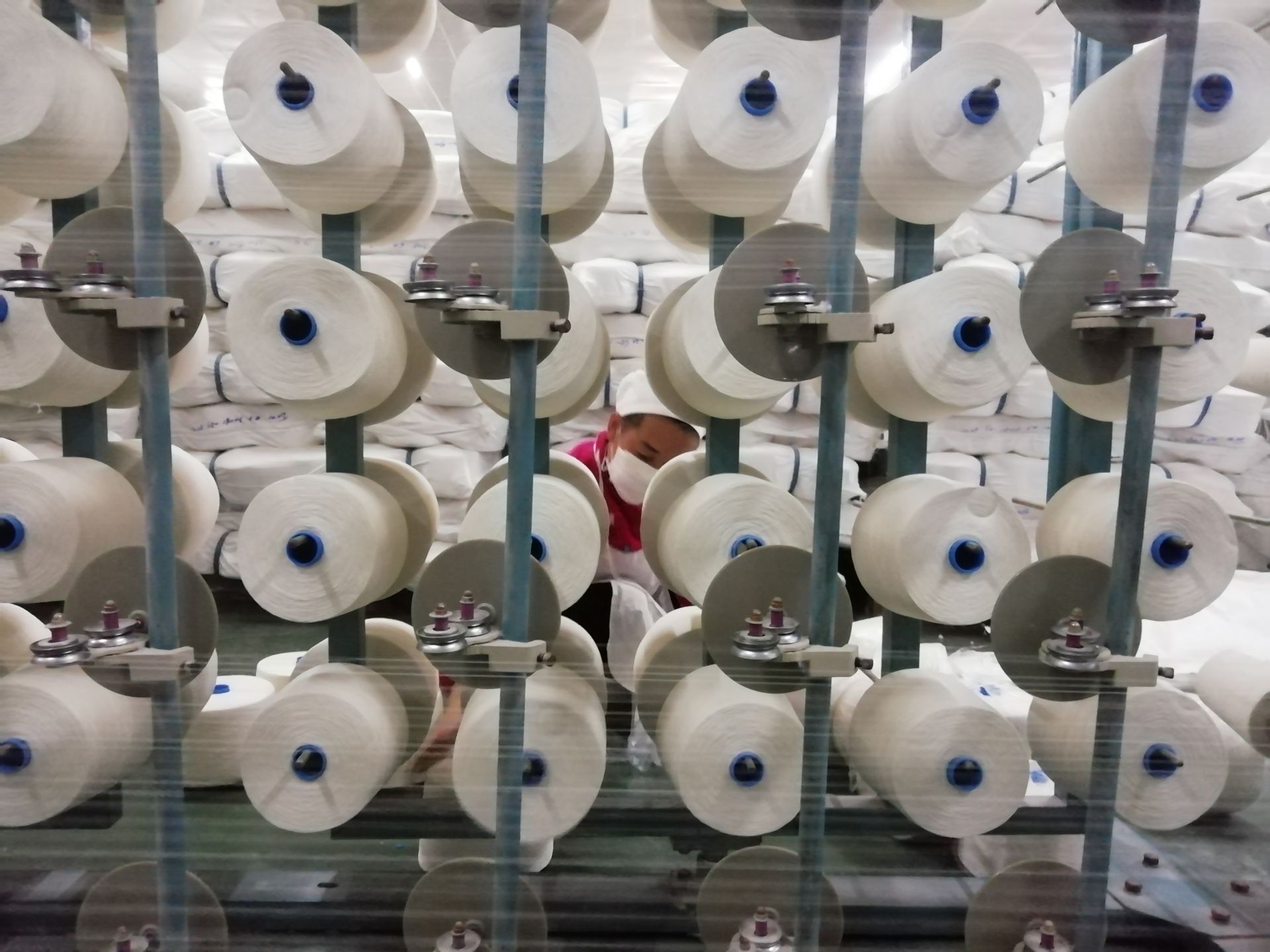 只见车间内,一排排纺织机器正满负荷运转,一根根细如发丝的棉线在机器设备间行云流水般穿梭,戴着口罩的工人在机器旁边忙着检查整理,一幅生产井然的画面跃入眼前。