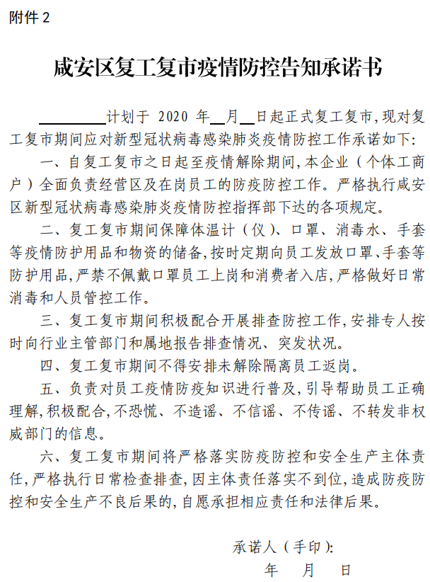 已复市的市场主体必须在经营场所醒目位置张贴所有从业 人员社区健康证明、《咸安区市场主体复工复市登记表》、《咸 安区复工复市疫情防控告知承诺书》,便于监管巡查。