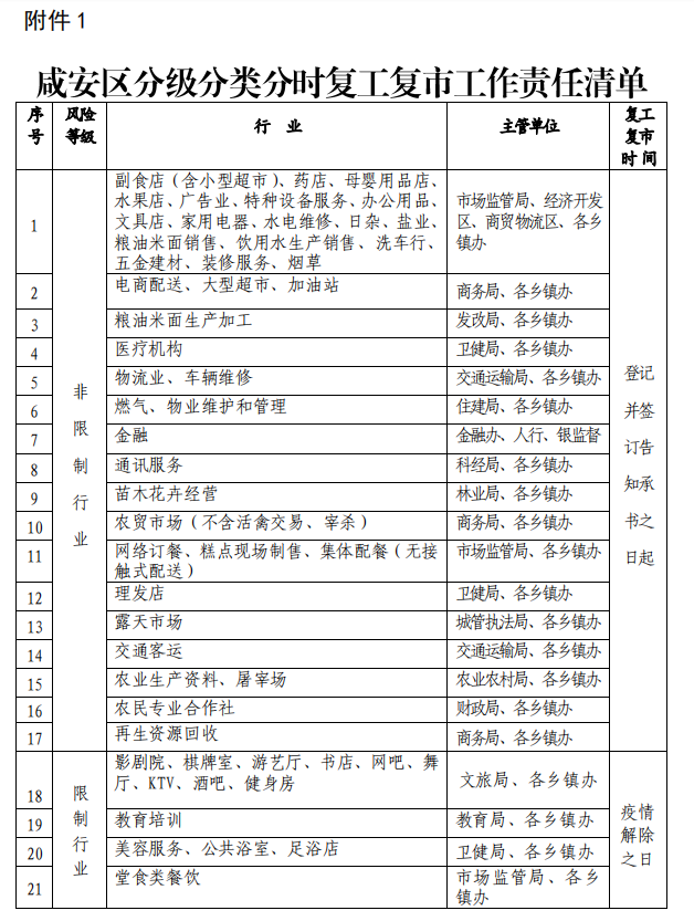 附件:1.咸安区分级分类分时复工复市工作责任清单