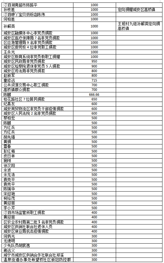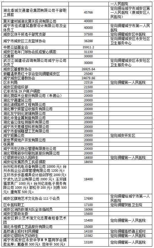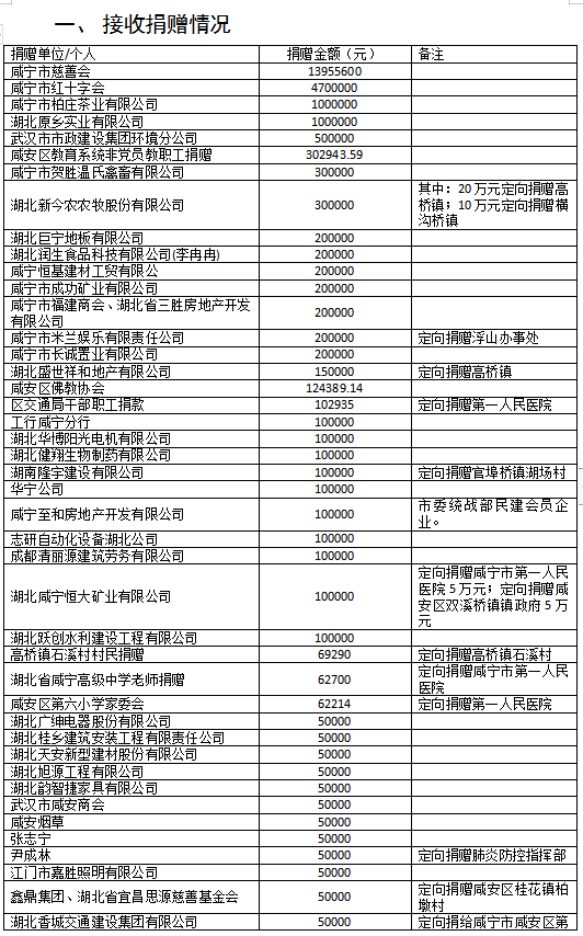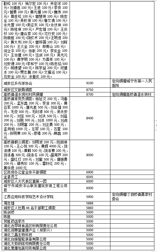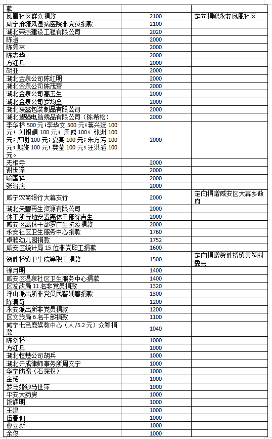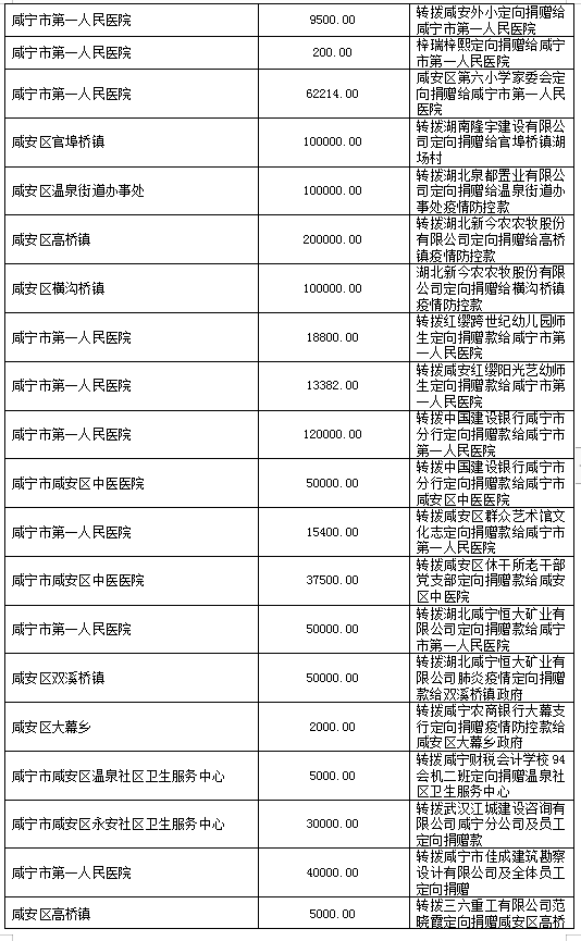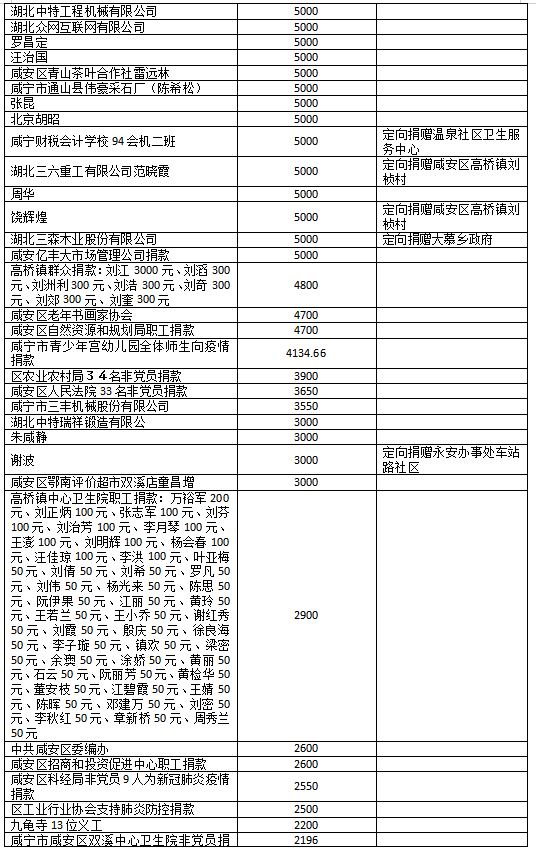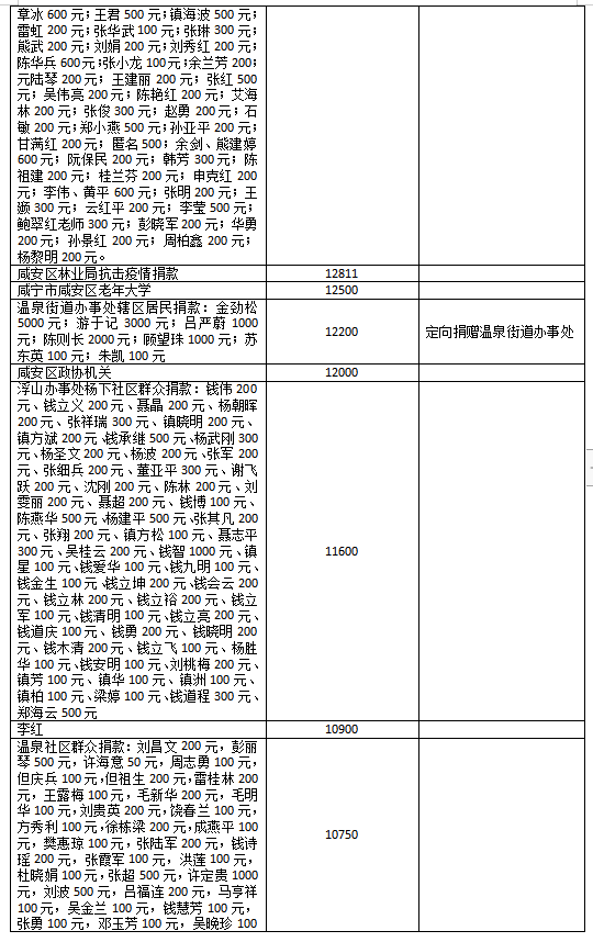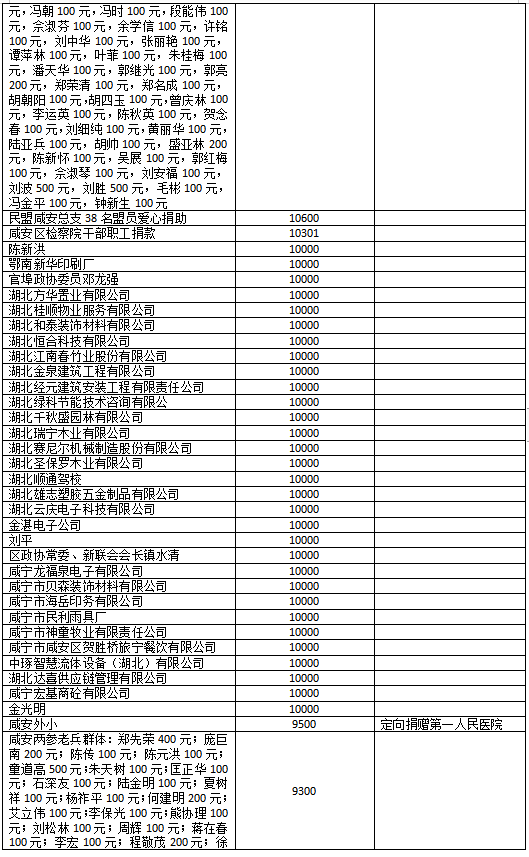 国家危难,匹夫有责;面对疫情,同舟共济!疫情发生以来,社会各界爱心如潮,关注、关心、支持咸安抗击疫情,慷慨解囊,无私奉献!
