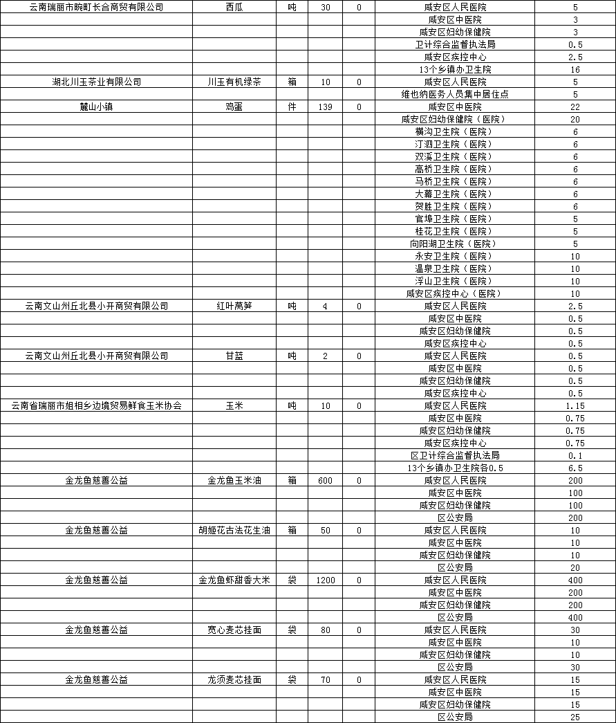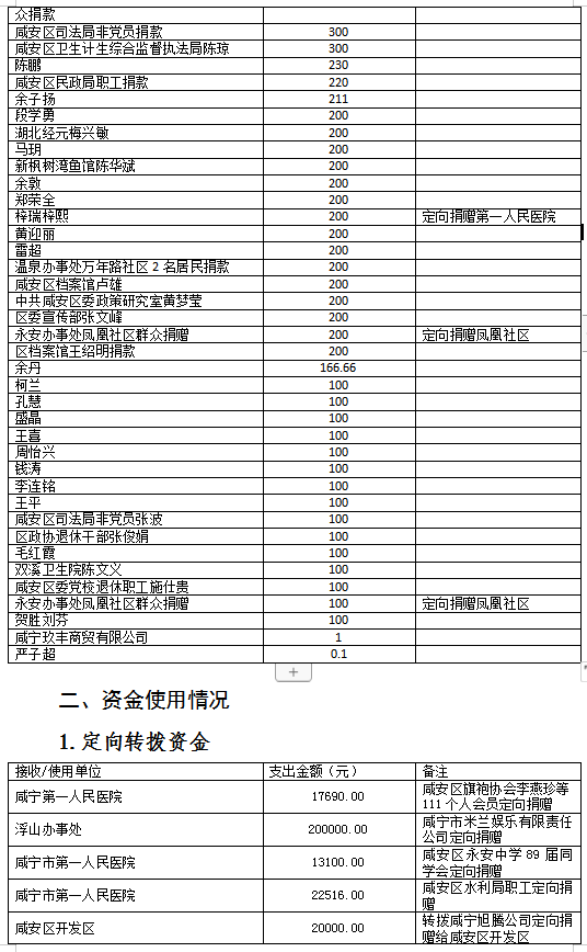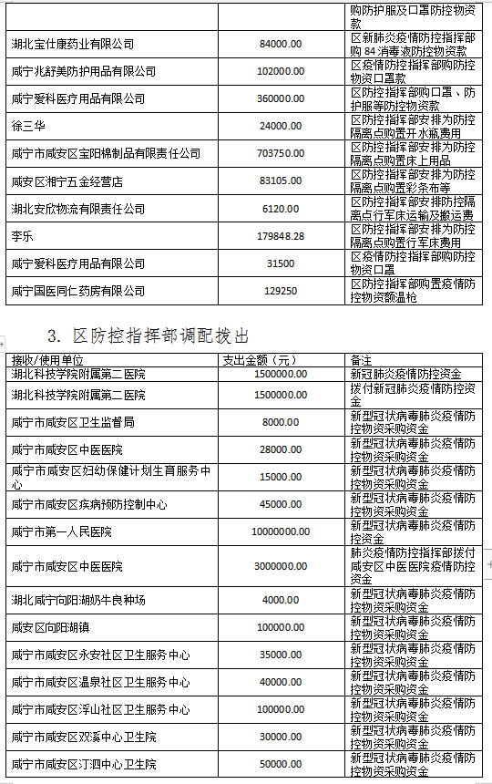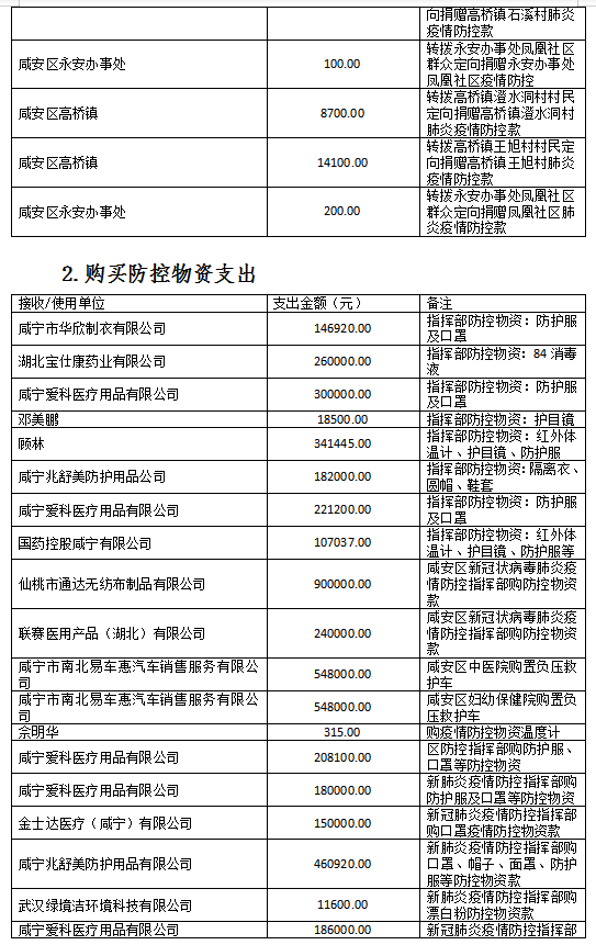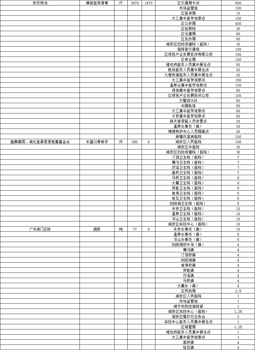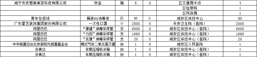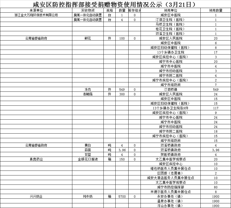 现将咸安区疫情防控指挥部接受社会各界捐赠的物资、资金使用情况公示如下,后续捐赠将持续公布,敬请关注!