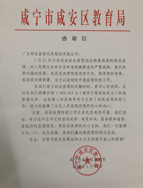 云上咸安报道(通讯员:金志权 吴秀芬)在新型冠状病毒肺炎疫情防控的特殊时期,广东邦宝益智玩具股份有限公司向咸安区教育局捐赠了价值壹佰万零叁拾贰元的四种爱心益智积木教玩具共5464盒,助力咸安区幼儿园复学,咸安区教育局对其无私的帮助和大力的支持表示衷心的感谢!