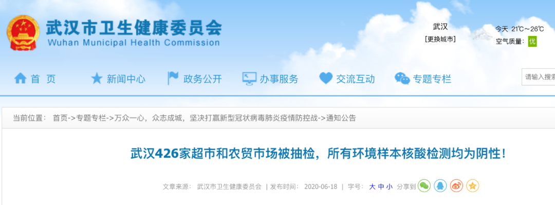 从6月13日起,我(武汉)市市、区疾控中心已连续6天对辖区内的超市、农贸市场等环境样本(包括环境和物品)进行采样检测,所有14954个样本新冠病毒核酸检测结果均为阴性。