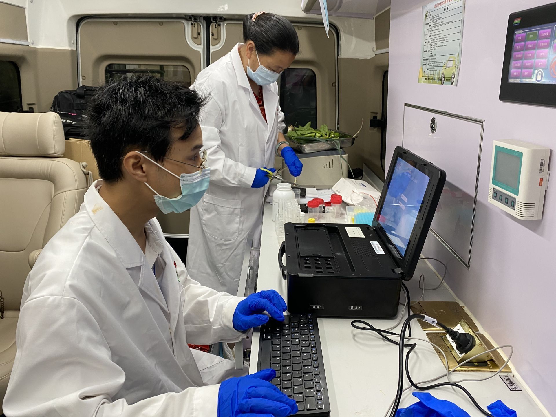 ▲区公共检验检测中心的工作人员正在对10多种菜品进行农残检测