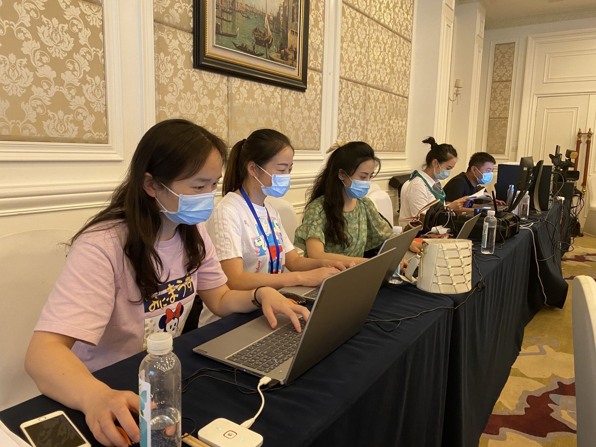 ▲会务保障人员正在将会议用品摆放整齐