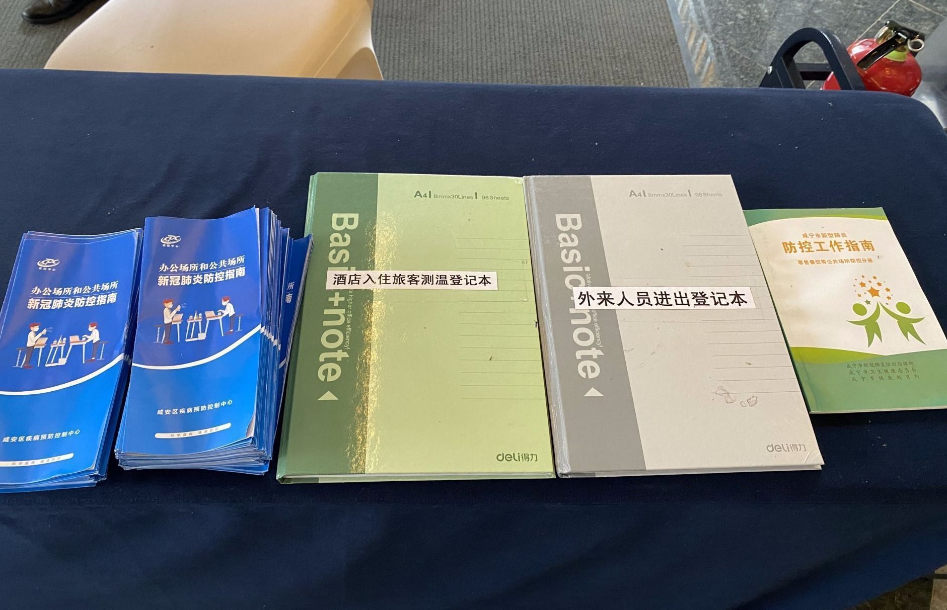▲入口处放置了疫情防控宣传单页和登记本