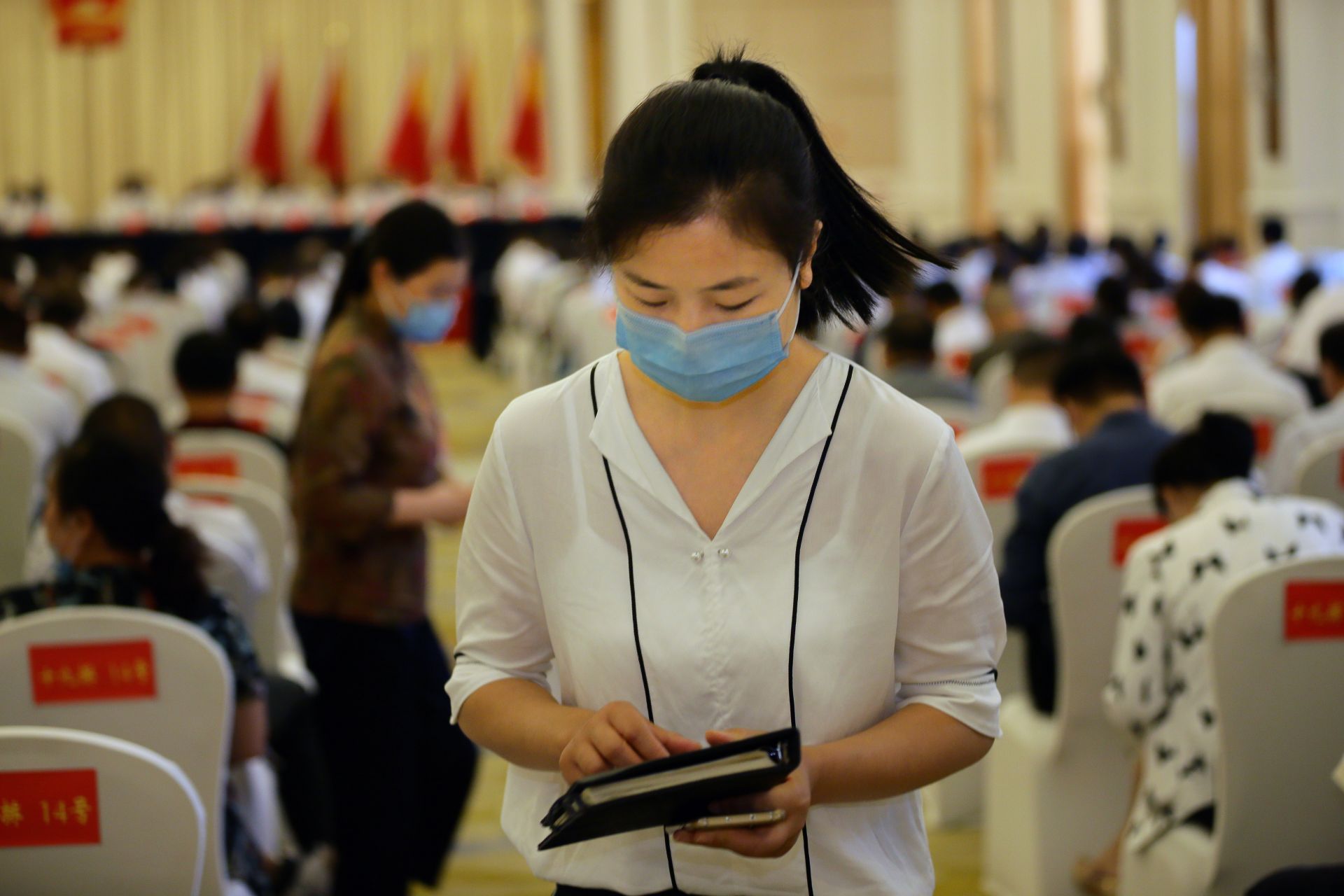 ▲会务保障人员正在整理文件资料