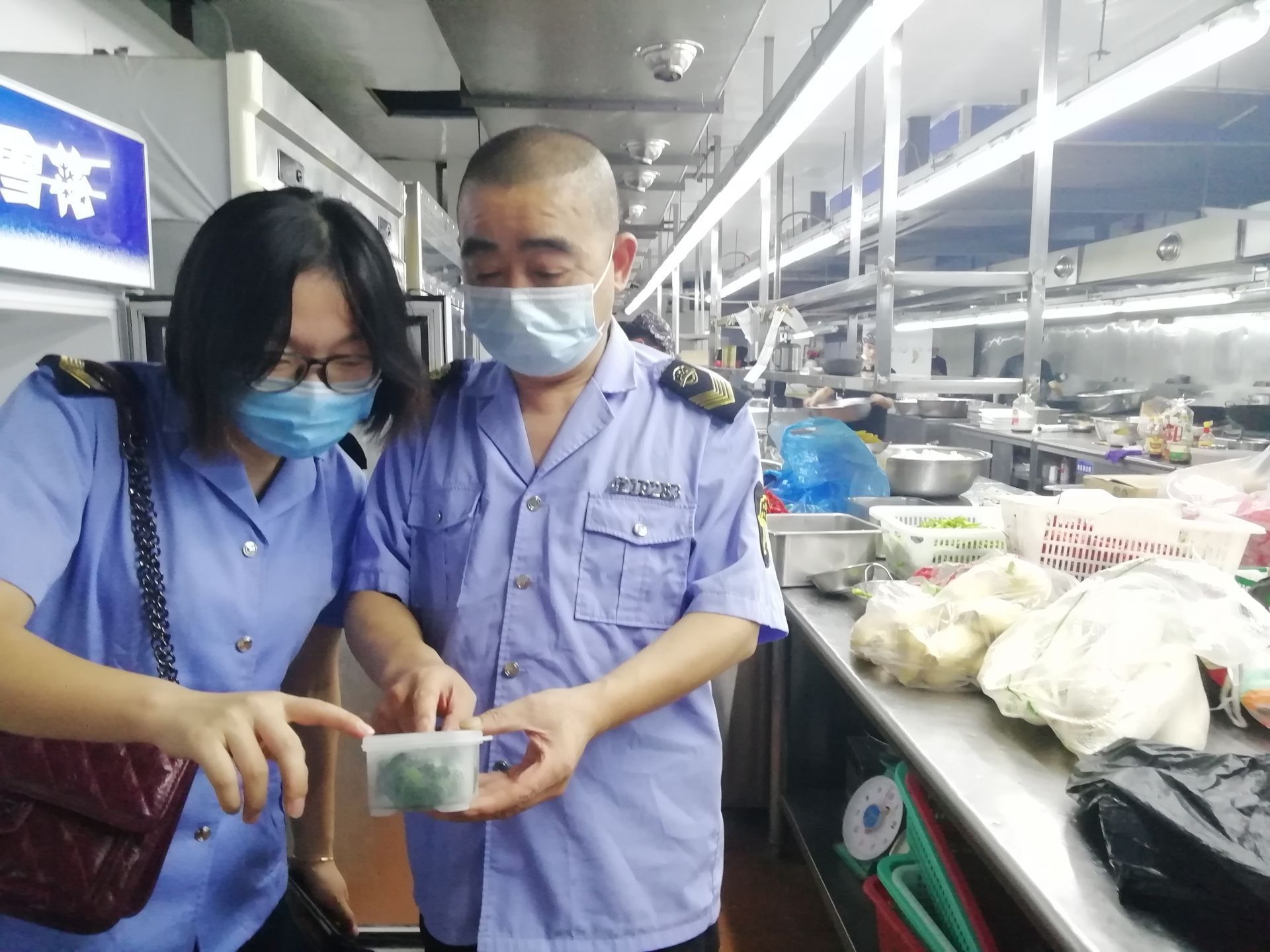 ▲市场监督管理局的工作人员正在对菜品进行抽检