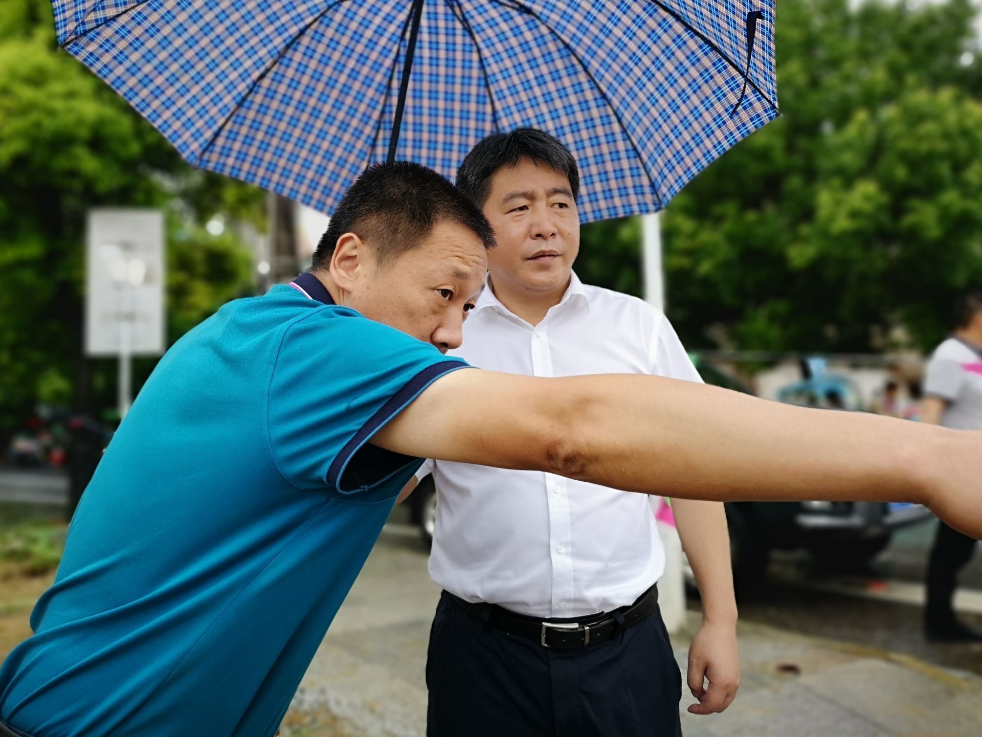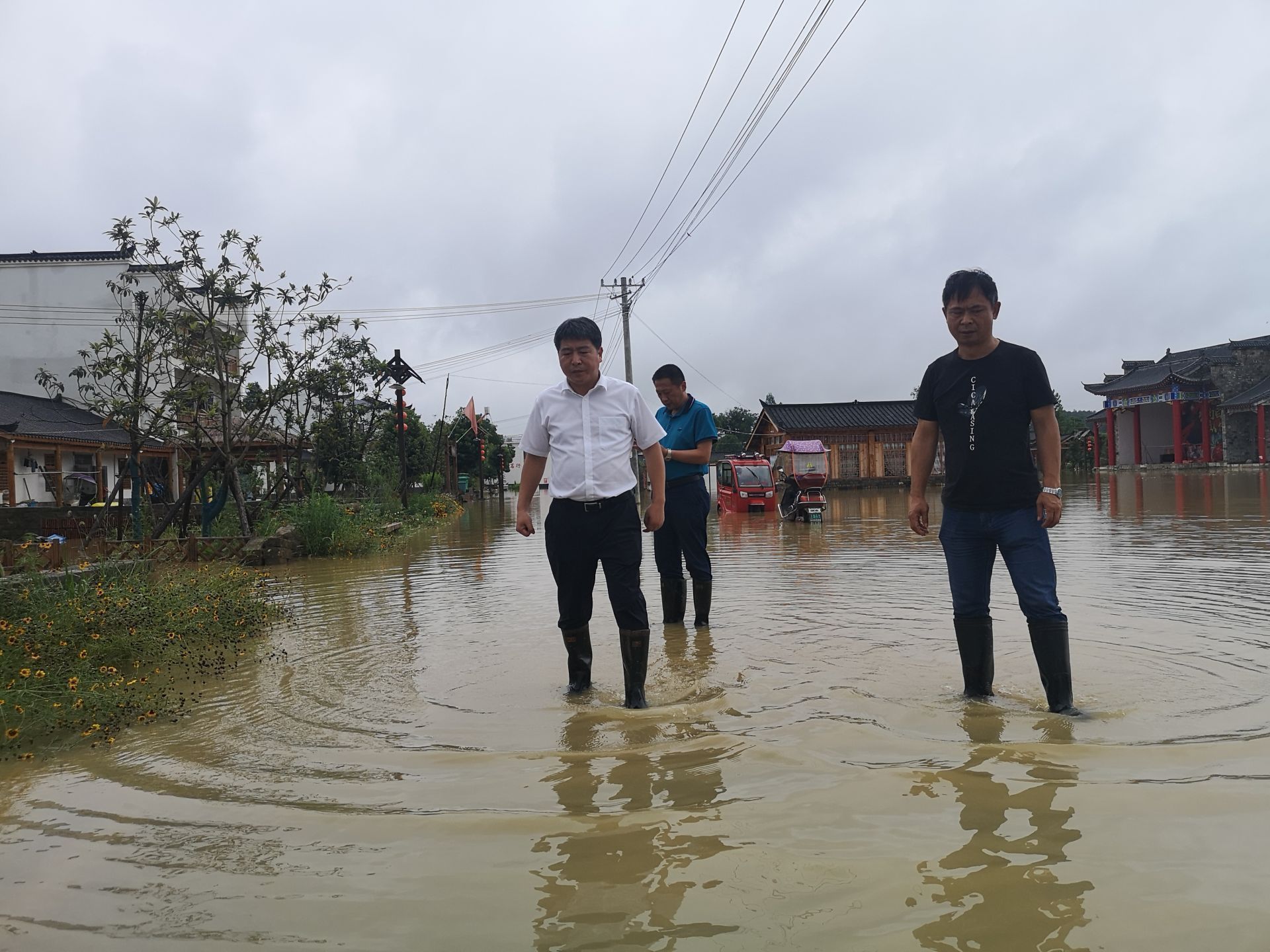 在双溪桥镇高桥河与杨堡河交界处,李文波与当地村民交谈,询问农田、西瓜受损情况。渠守河路段因强降雨导致路面积水,李文波要求有序组织好交通秩序,同时积极带领群众开展好生产自救。