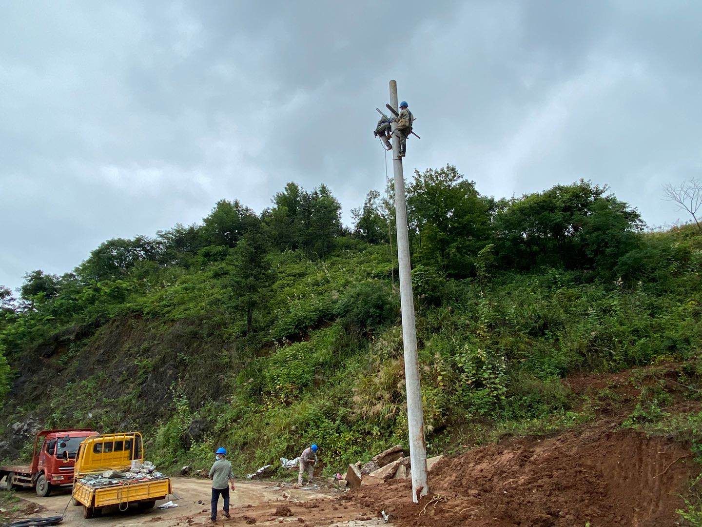 倒断电杆原处于容易滑坡位置,经过现场勘察,决定绕过原立杆处,将线路“搬家”到更安全更稳定的山坡下,并在原有线路基础上重新架设3根15米高压电杆,打下两根拉线,放线300米。
