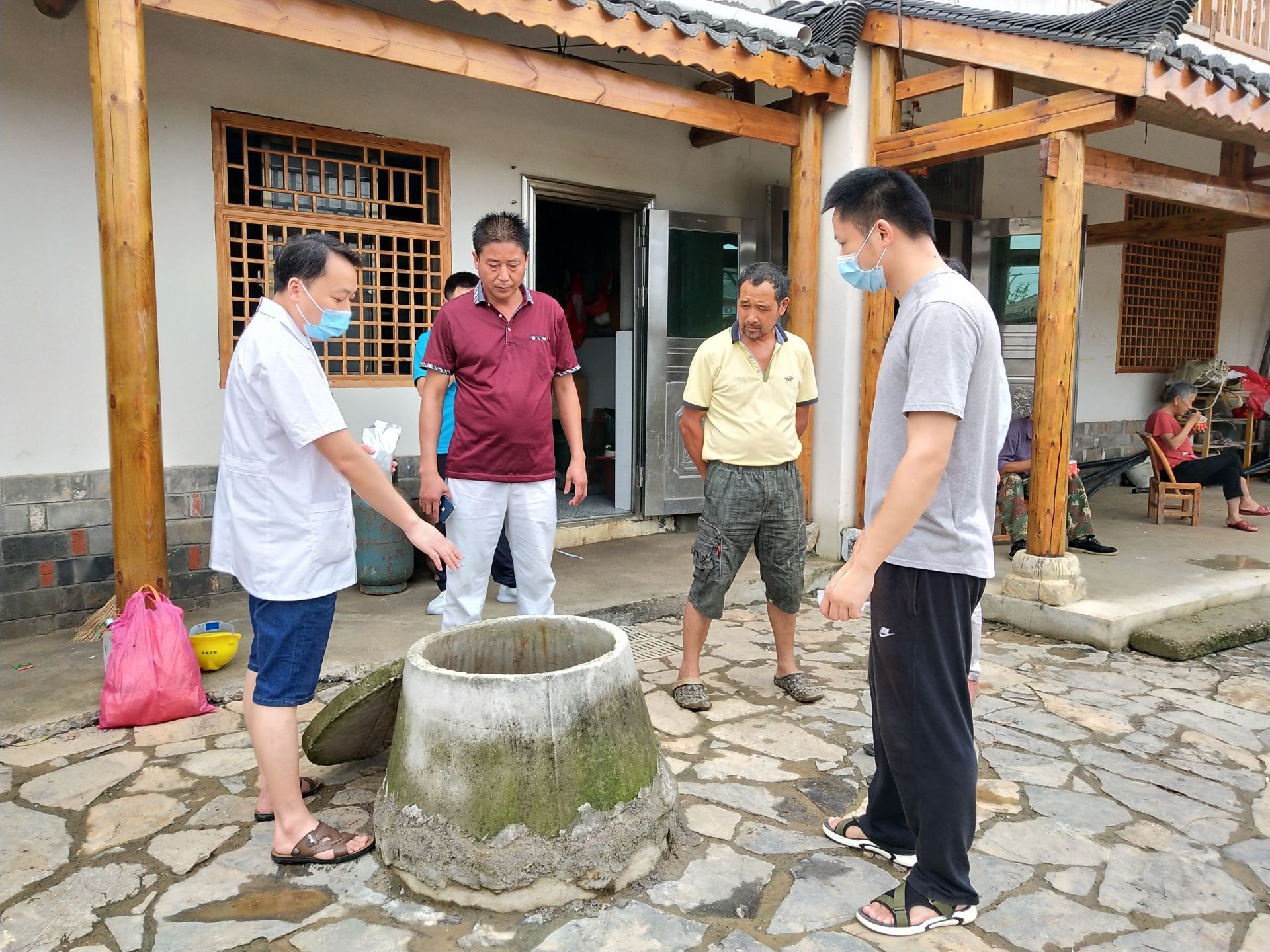 “水井消毒要先把水抽了,再投放消毒药,药剂用量要根据水井水量投放。”在白水畈美丽村湾,区疾控中心消杀组金明详细地向村民介绍水井消毒注意事项。镇卫生院的医生们先是向村民现场培训了消毒剂如何配比使用,随后和村民们一道投身到消杀工作中,对白水畈戏台广场,村湾道路及屋场前后进行全面消毒。