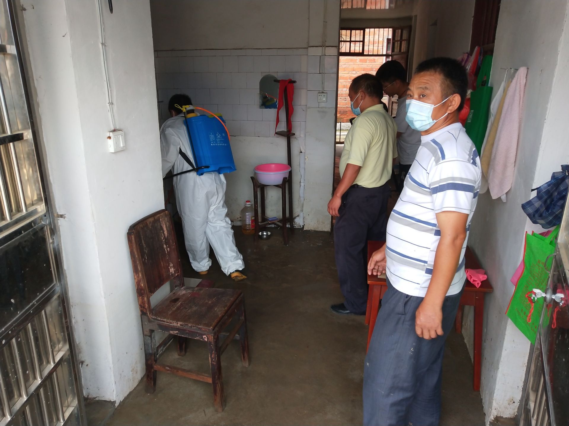 在沿河西路巷道,由于紧挨河边,沿河住房一楼几乎全部被淹,河水退去后,泥浆遍地。社区工作人员孟江湖带领着消杀人员,一边对小巷及死角进行消毒,一边挨家挨户对群众宣传,动员大家自己动手,家家户户开展大清洗,大消毒,并告知居民们如果没有消毒物资可到社区免费领取。