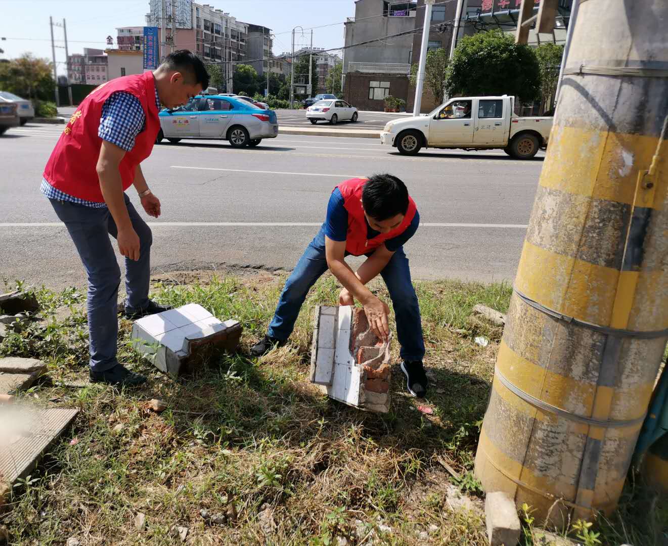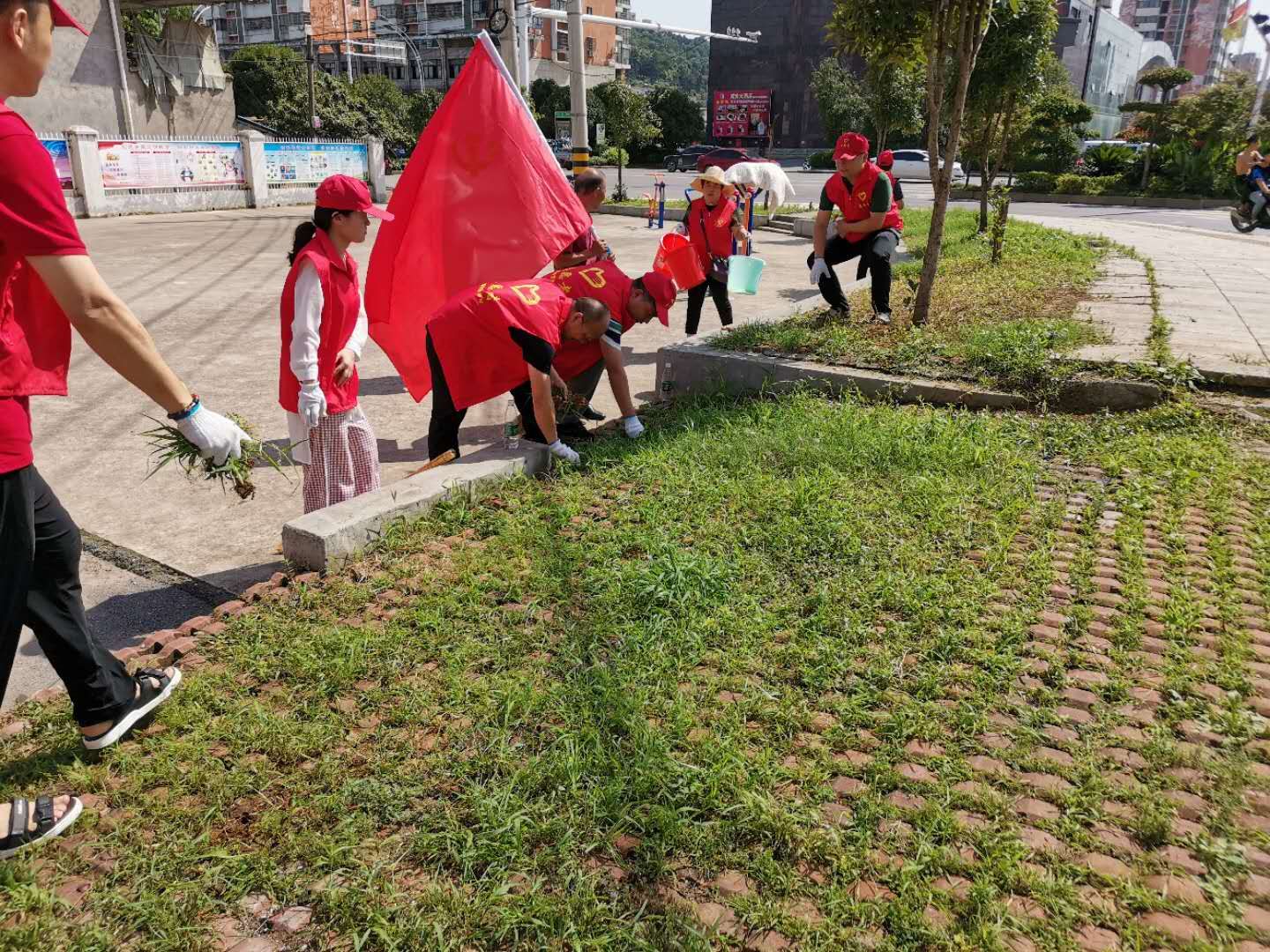 在社区小广场路沿上,杂草丛生、废弃石块随意堆放在路边,看起来杂乱无章。针对这一情况,党员志愿者们明确分工迅速行动,一部分人码放石块,另一部分人则开始拔草行动,经过一个多小时的努力,废弃石块码放整齐,路边杂草也得到清理。