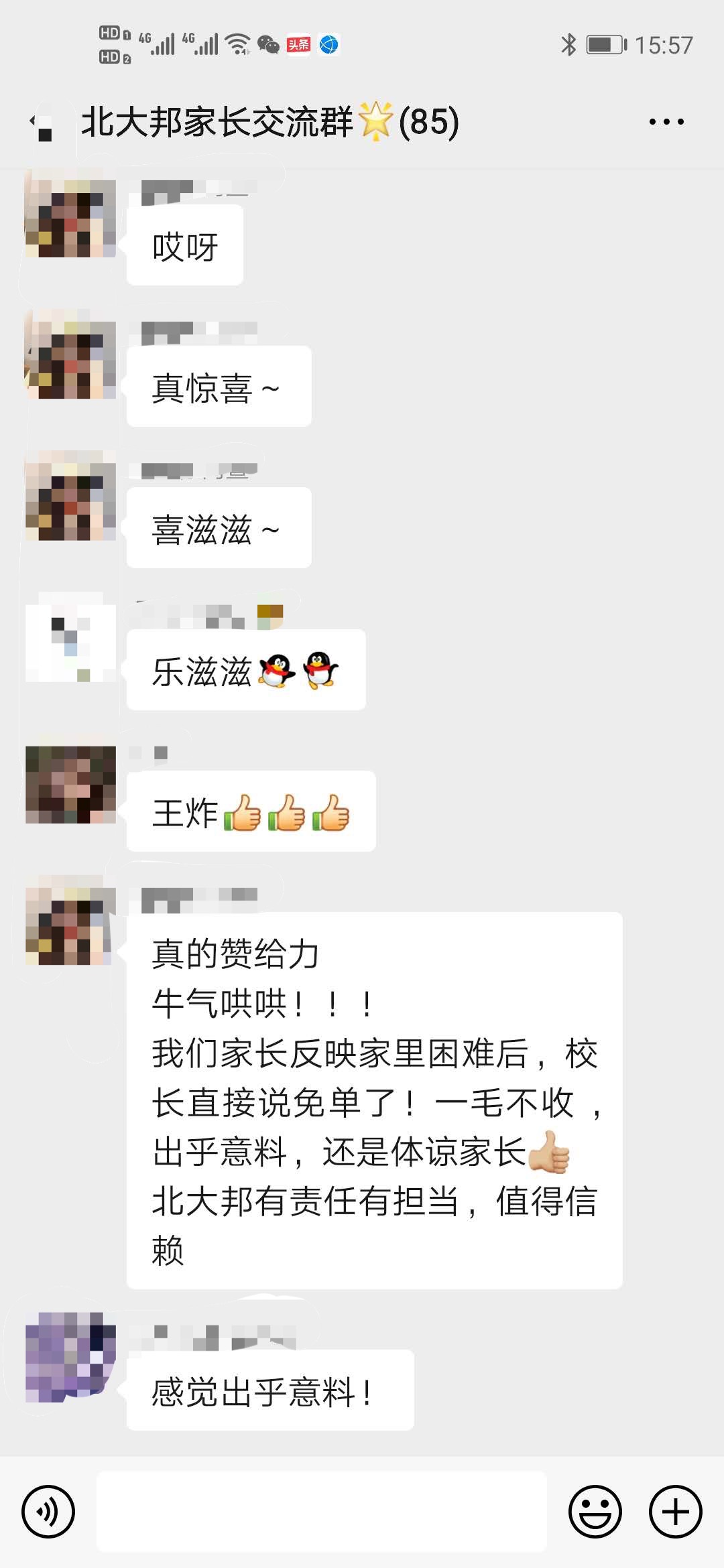 消息一出,家长一致叫好。梓山湖北大邦学校校长纪曹文表示,感恩、责任、协同、创新,这是北大邦学校的精神文化!目前,学校更加关注的是学生的教育,学校将继续按照集团部署开展好暑假期间的教育教学工作,办好咸宁人民家门口的好学校。同时,对于老师的福利待遇问题,将通过向上级部门和央行低息贷款请求支持。
