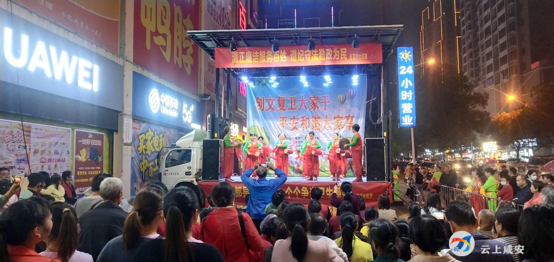 云上咸安报道(咸宁台记者:胡晓轩 通讯员:阮君)10月29日晚,由咸安区温泉办事处、咸安区楚剧团、希望桥社区联合主办的“创文复卫大家干 平安和谐大家享”为主题的文艺晚会在中百仓储购物广场咸宁店门前举行,精彩的演出吸引了附近数百名居民及过路群众驻足观看。