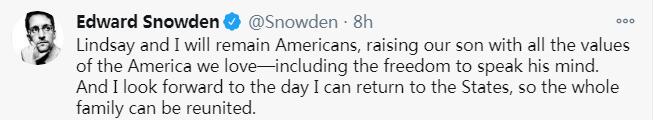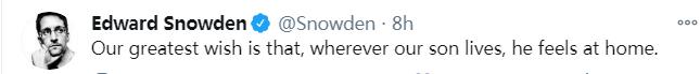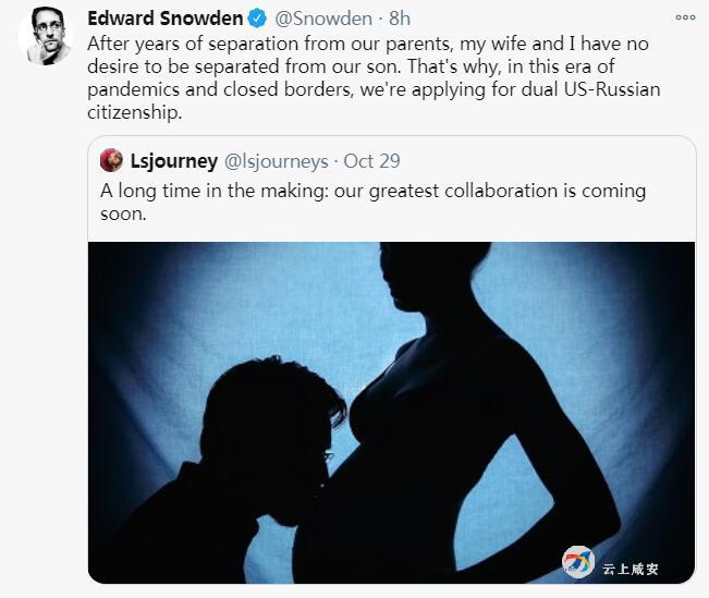 斯诺登在推文中写道,“在与我们的父母分开多年后,我的妻子和我不想与我们的儿子分离。这就是我们在这个疫情泛滥、边境封锁的时候申请美俄双重国籍的原因。”