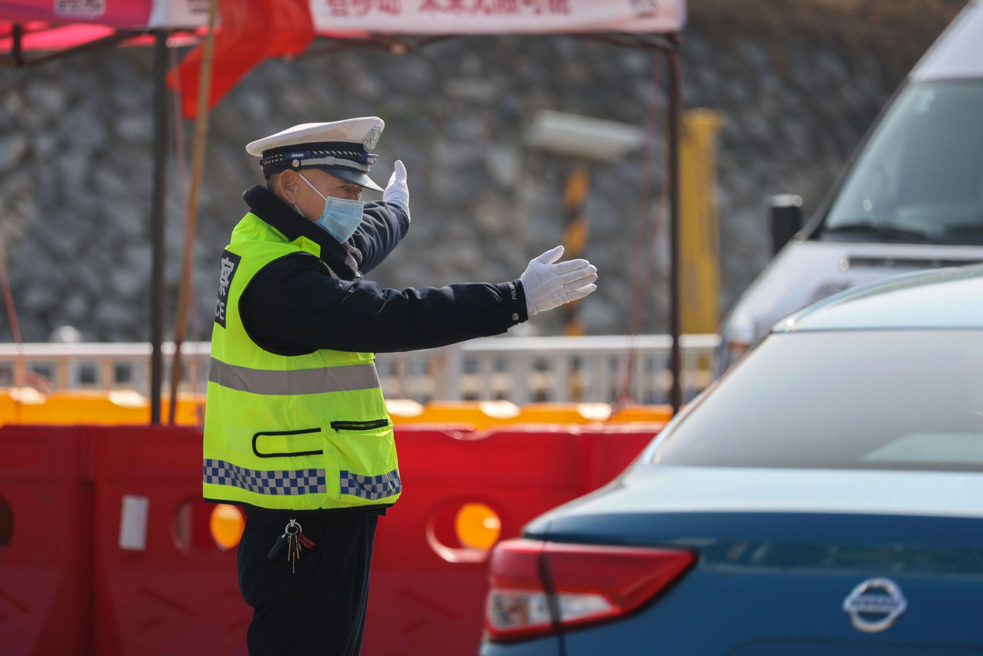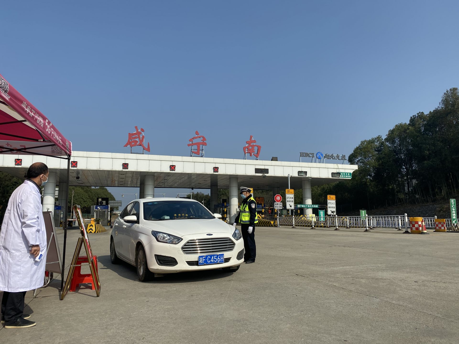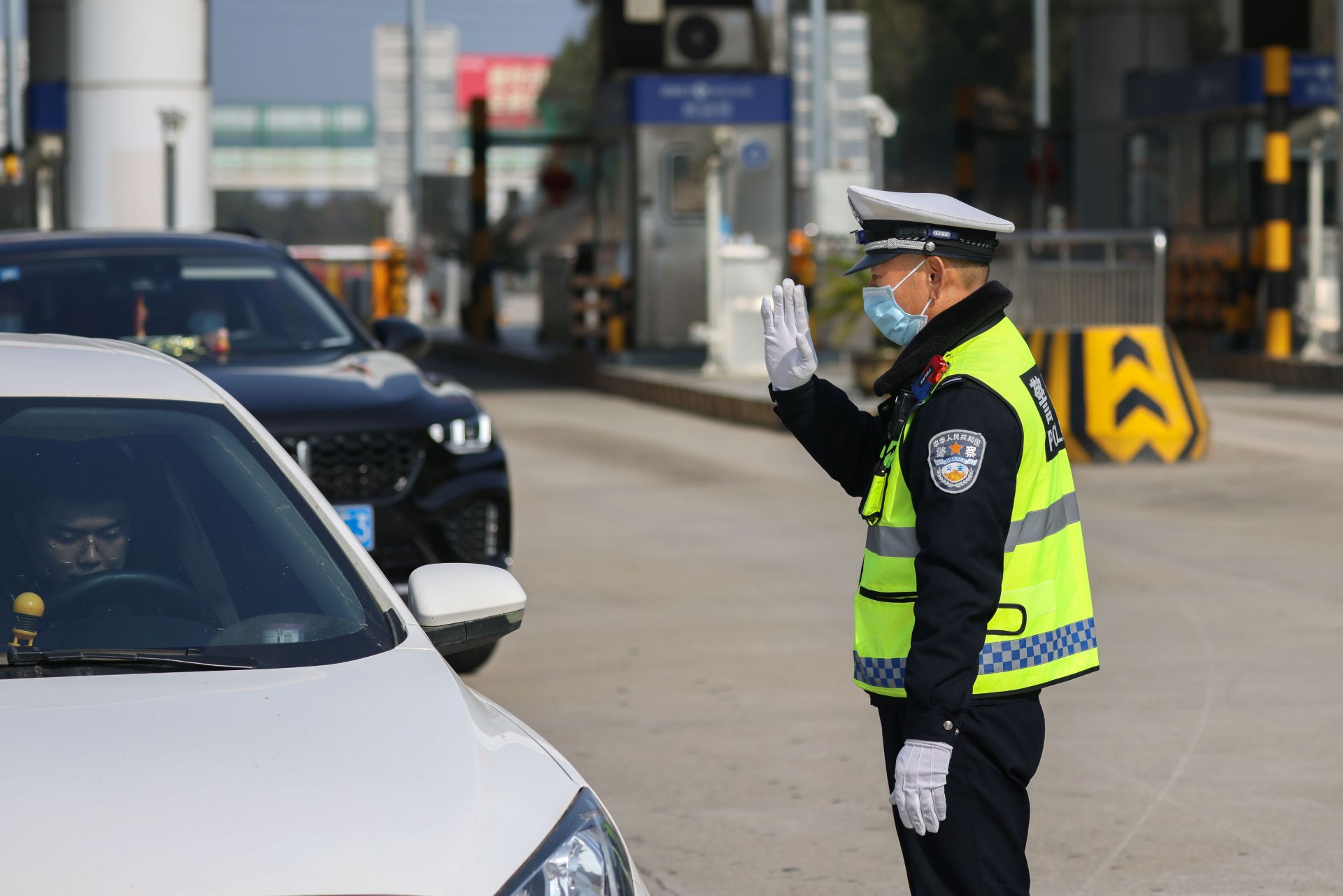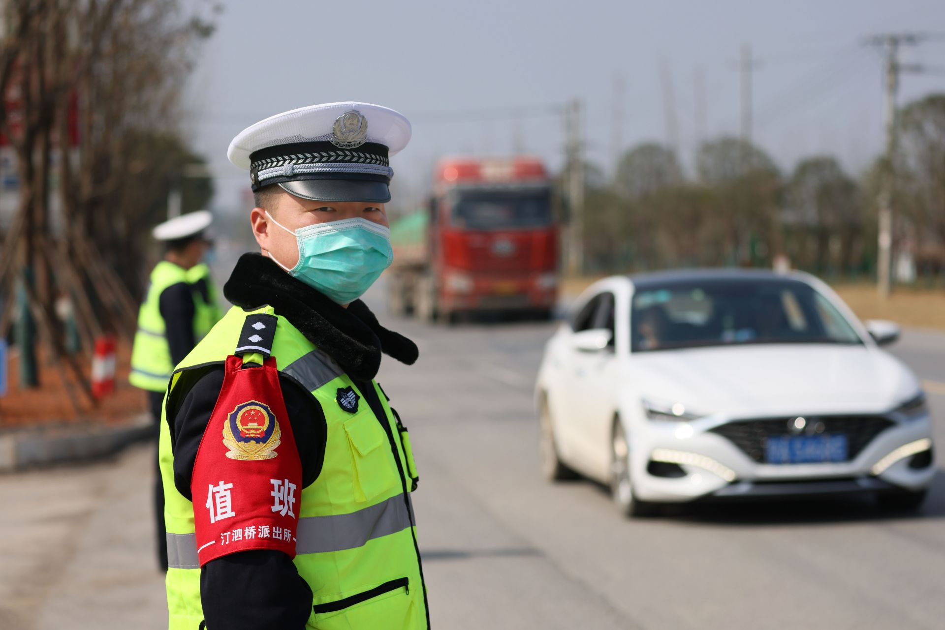 咸安公安分局交警大队执勤民警费世进(跟去年跟往年比较的话,今年车流量较小,跟疫情相关,好多人在原地就没回来过年,针对这个车流量较小情况呢,往年都是设定的固定岗交通管制,今年针对这个车流量较小,大队安排就是机动巡逻,全员上岗,加强对路面的交通管制,哪里有堵点机动人员全员上。)