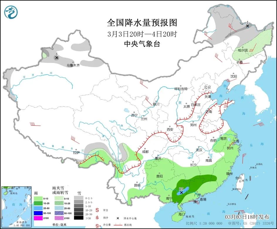 3日20时至4日20时,内蒙古东北部、东北地区中北部、新疆北部和西部、西藏东部等地部分地区有小到中雪或雨夹雪。西藏东南部、江淮东部、江南大部、四川盆地南部、云南南部、华南等地部分地区有小到中雨,局地大雨。