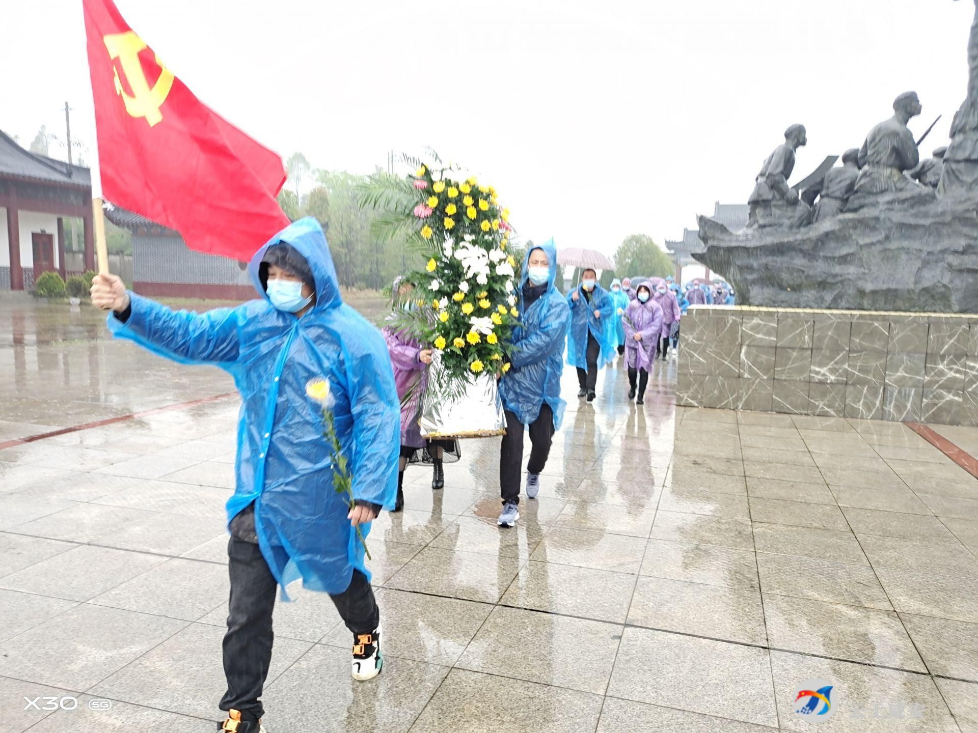 抵达鄂南烈士陵园后,全体党员整齐列队,静思默哀,社区党委书记胡青山带领大家向烈士纪念碑三鞠躬,为革命先烈敬献花篮,表达对革命先烈们的深切哀悼和崇高敬仰。鲜红的党旗迎风飘扬,入党誓词铿锵有力。40余名党员手持鲜花,庄严有序地在雨中祭奠缅怀英烈,追忆英雄事迹。