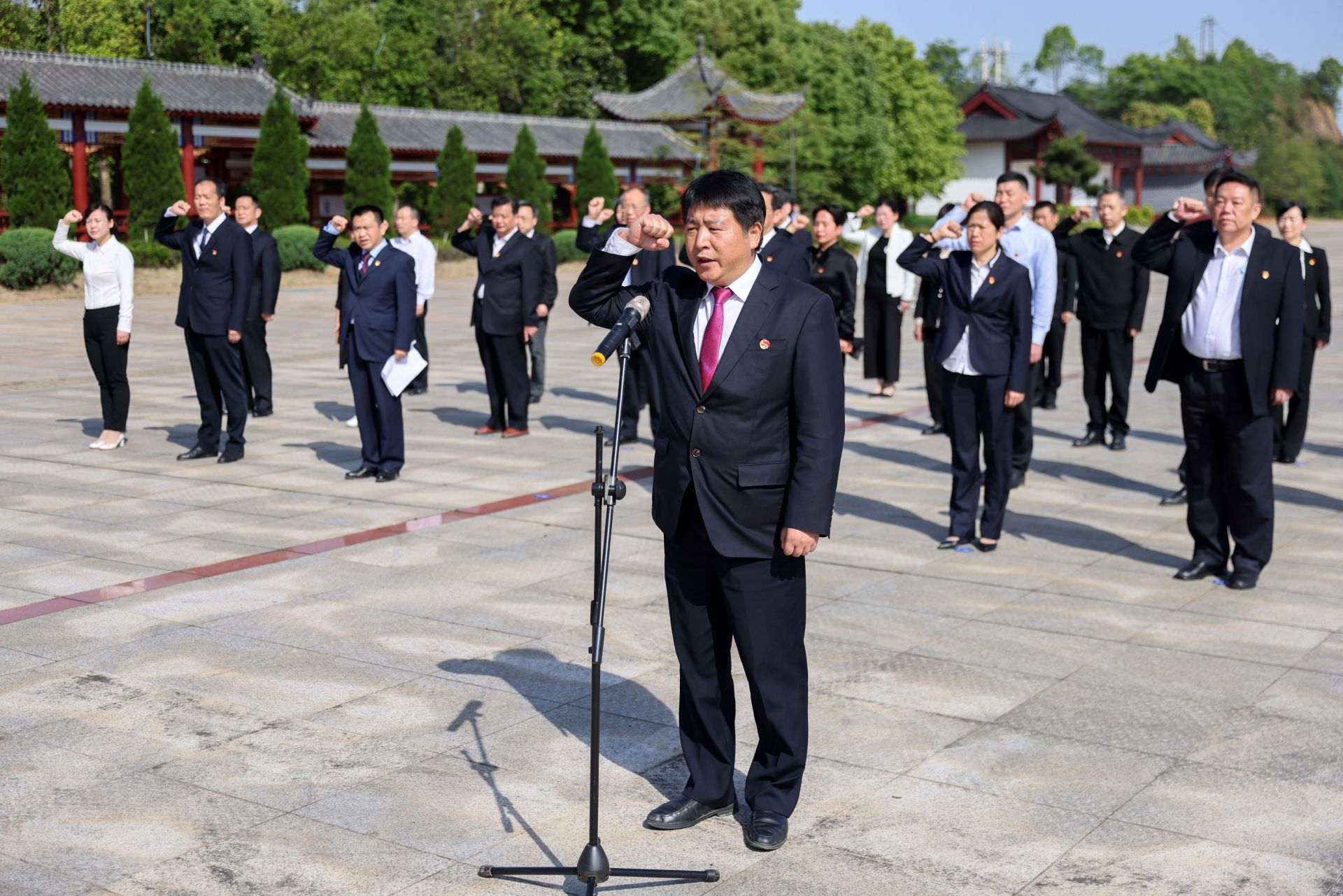 李文波带领全体党员,面向党旗,举起右拳,集体重温入党誓词,铿锵有力的铮铮誓言在苍松翠柏环绕中的烈士陵园回荡。区委理论学习中心组成员拾级而上,集体绕烈士纪念碑一周,瞻仰烈士,并向长眠于此的鄂南烈士敬献鲜花。