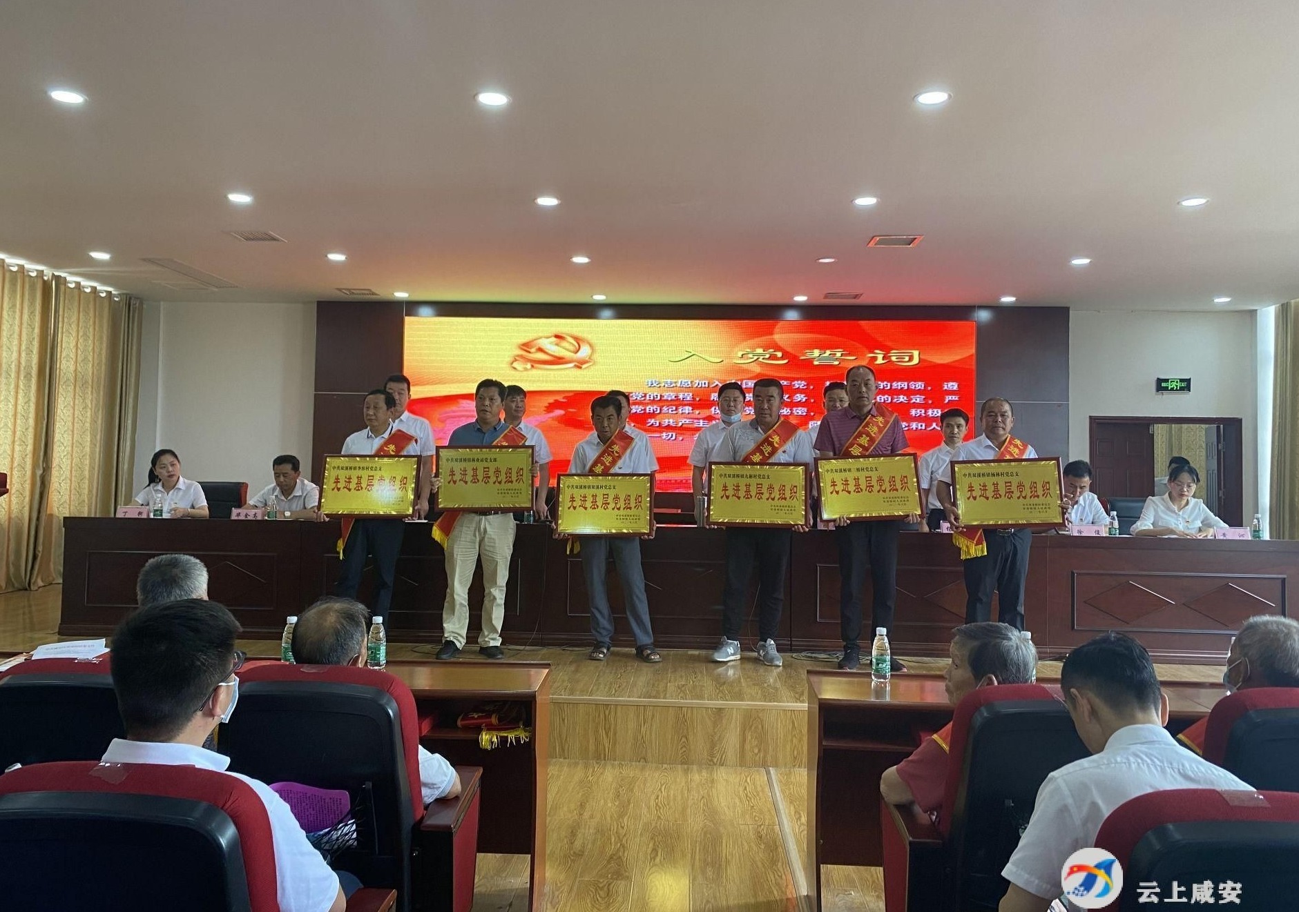 表彰大会在庄严的《义勇军进行曲》中拉开序幕,全体起立唱国歌。随后,大家纷纷举起右拳,重温入党誓词。大会还对全镇6个先进基层党组织、15名优秀党务工作者、57名优秀共产党员进行表彰,并为10名“光荣在党五十年”老党员代表颁发纪念章。