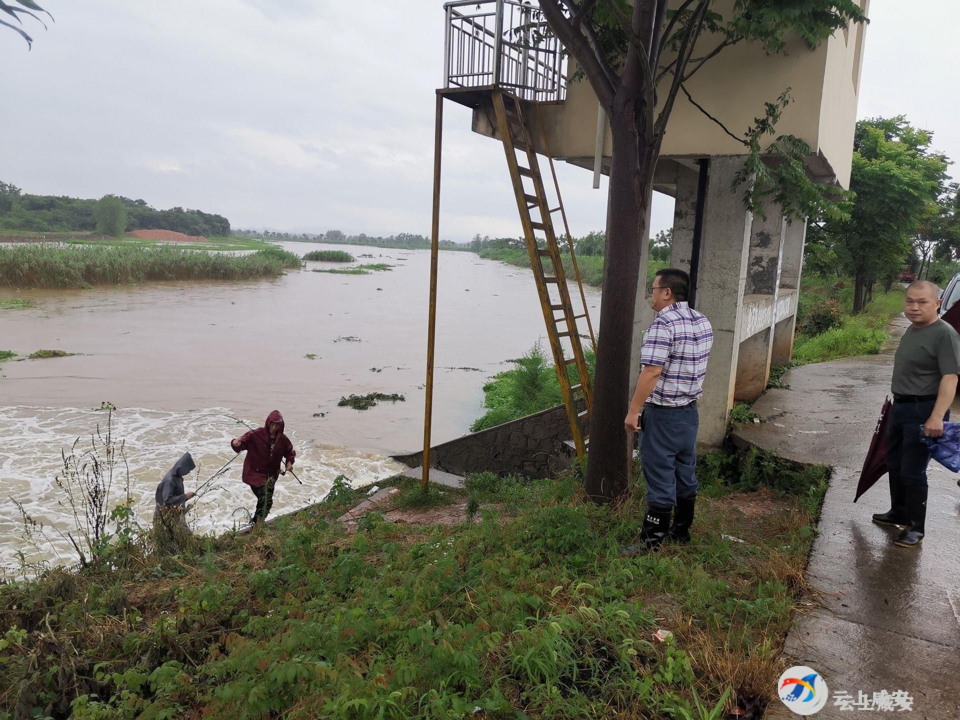 “暴雨危险,大家收拾渔具赶紧离岸。”在窑咀村1组下泵站,巡查人员及时劝阻钓鱼人员,并有序指导河中钓鱼人员安全离开。