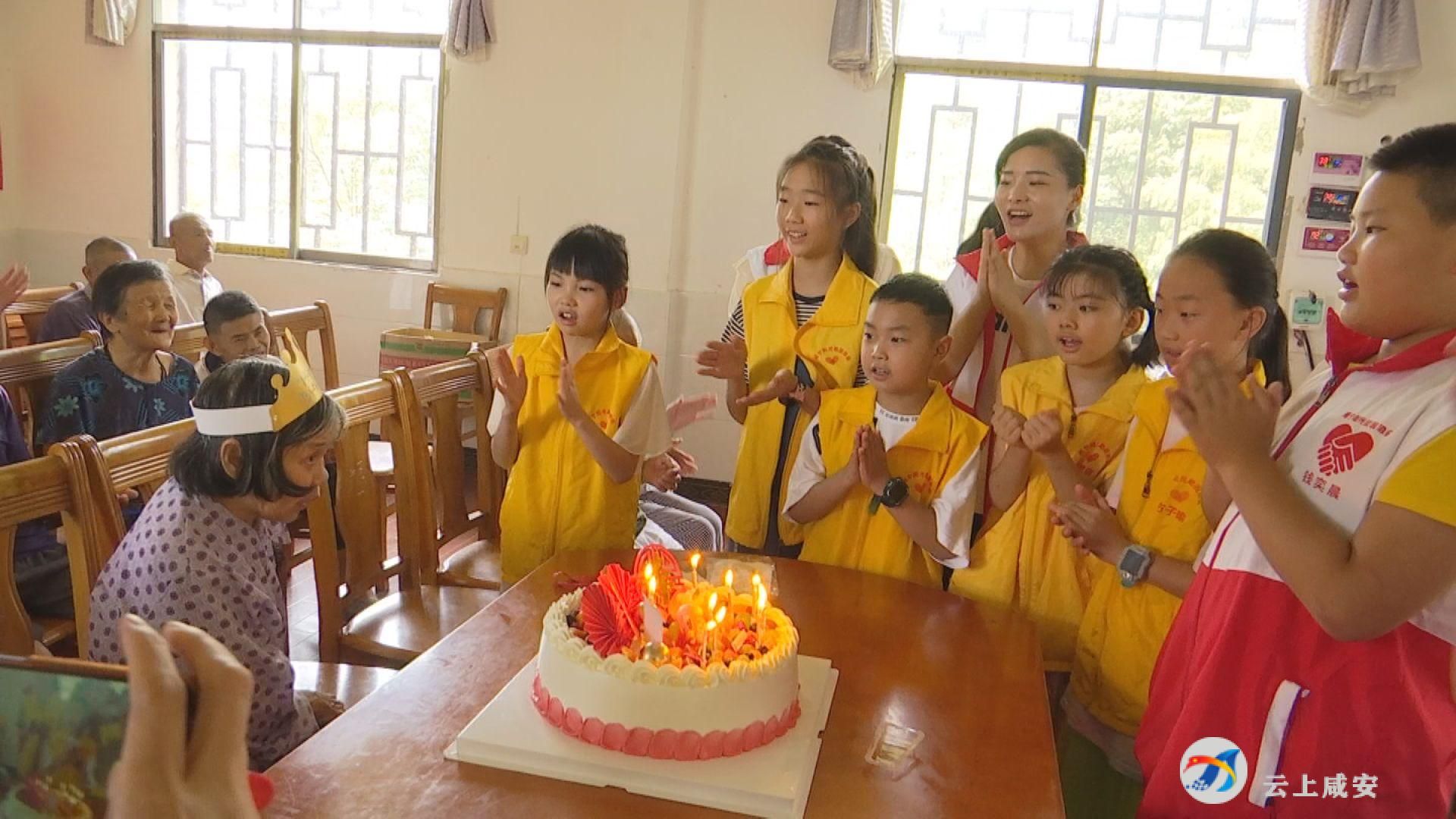 “手掌放在肩膀,用手指轻轻捏,来回横向运动。”大幕乡福利院广场树荫下,志愿者周先生正带着小天使志愿者们一起为老人按摩、捶背。饭厅里,大家兴致勃勃的为74岁失能老人陈奶奶戴生日帽、唱《生日歌》,给老人们分发生日蛋糕。老人吃着香甜的蛋糕,看着孩子们灿烂的笑容,开心不已。