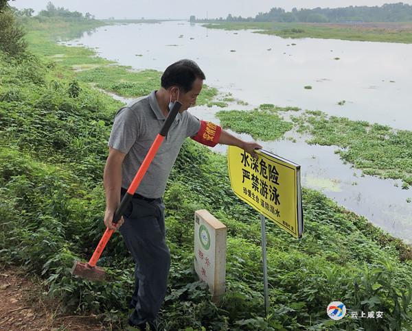 云上咸安报道(特约记者 陈涵 通讯员 吕威)水深危险,严禁游泳。珍爱生命,谨防溺水。8月11日,官埠桥镇窑咀村党总支书记雷夕鹏带领村干部,在斧头湖沿岸竖立有关预防溺水内容的警示牌,进一步强化群众安全意识。