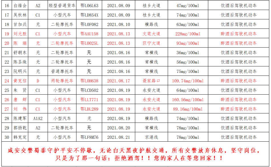 2021年8月1日至8月24日,咸安公安分局交警大队共查获酒驾30起,其中醉驾12起,现予以实名曝光: