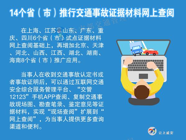 在上海、江苏、山东、广东、重庆、四川6个省(市)试点证据材料网上查阅基础上,新增北京、天津、河北、山西、江西、湖北、湖南、海南8个省(市)推行交通事故证据材料网上查阅。当事人在收到交通事故认定书或者事故证明后,可以通过“交管12123”APP查阅、复制交通事故证据材料,实现“现场查阅”扩展到“网上查阅”,为当事人提供更多查询渠道和便利。