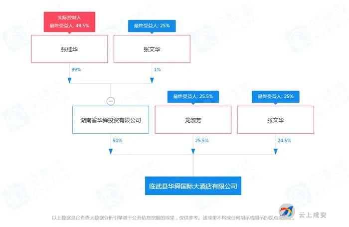 企查查显示,临武国际大酒店由湖南省华舜投资有限公司投资兴建,是目前临武县一家按照五星级标准设计建造的酒店;临武县华舜国际大酒店有限公司注册资本2000万元,法定代表人和最终受益人为张文华,透过股权穿透,它的另一位实际控制人和最终受益人为张桂华。