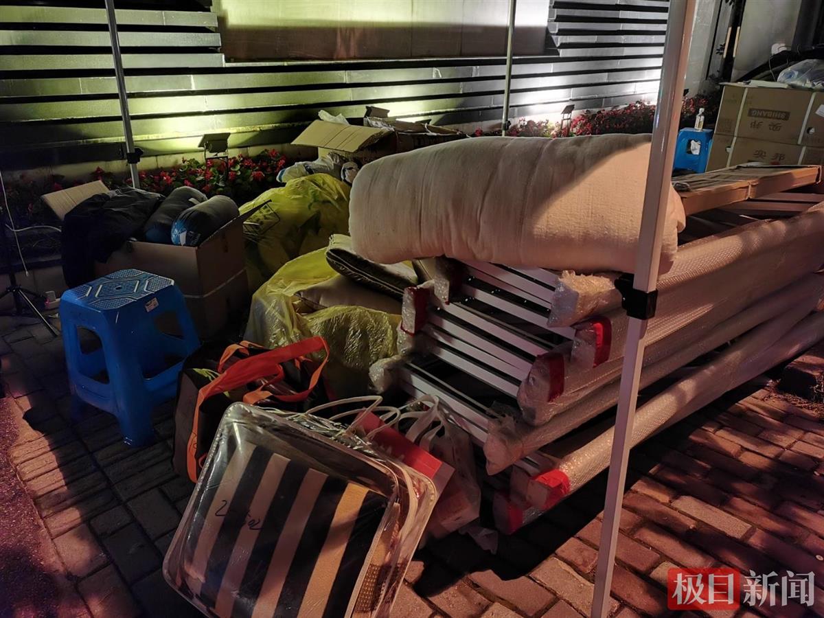 有志愿者称,他们需要值守到26日早上。记者注意到,工作人员身旁堆放着许多棉被。志愿者们介绍,这是相邻的香梅花园小区二期业主送来的御寒物资,主要是棉被。