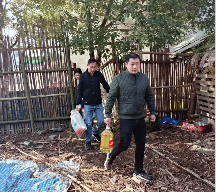 原来这位老人是居住在双溪桥镇杨仁村的一位孤寡聋哑老人,怕老人不明白自己的意思,只能“手脚并用”的表达自己的关心。从村支书了解到老人情况后,余涛自掏腰包,购置米面油、毛衣等物品,与村委会一同上门慰问。