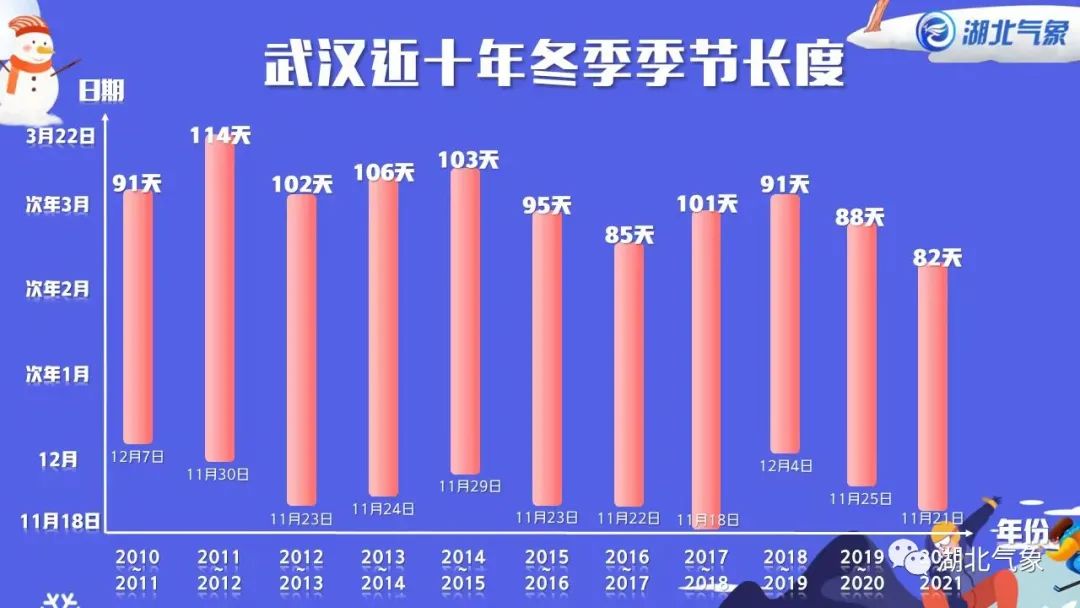 从1961年至今的气象监测数据显示,湖北省的冬季长度呈变短趋势,武汉市去年冬季时间最短,仅82天。今年武汉市已于11月23日入冬,今年冬天到底有多长还有待观察。