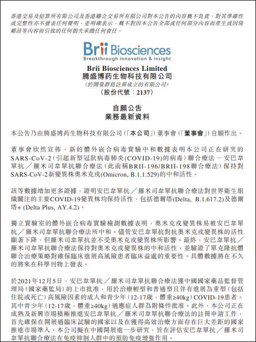 12月12日晚间,腾盛博药宣布,新的体外嵌合病毒实验中和数据表明其安巴韦单抗/罗米司韦单抗联合疗法(此前称BRII-196/BRII-198联合疗法)保持对新型冠状病毒变异株奥密克戎(Omicron) 的中和活性。