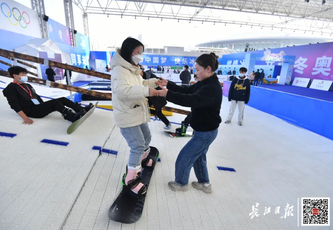 20日上午,记者在现场看到,现场分成冰雪知识大讲堂、冰雪项目体验、冰雪器材展示和中华冰雪文化创作四大模块,结合特色民俗、非遗文化创作与冰雪运动相关的作品,讲述“中国冰雪”故事,推广江城体育文化。